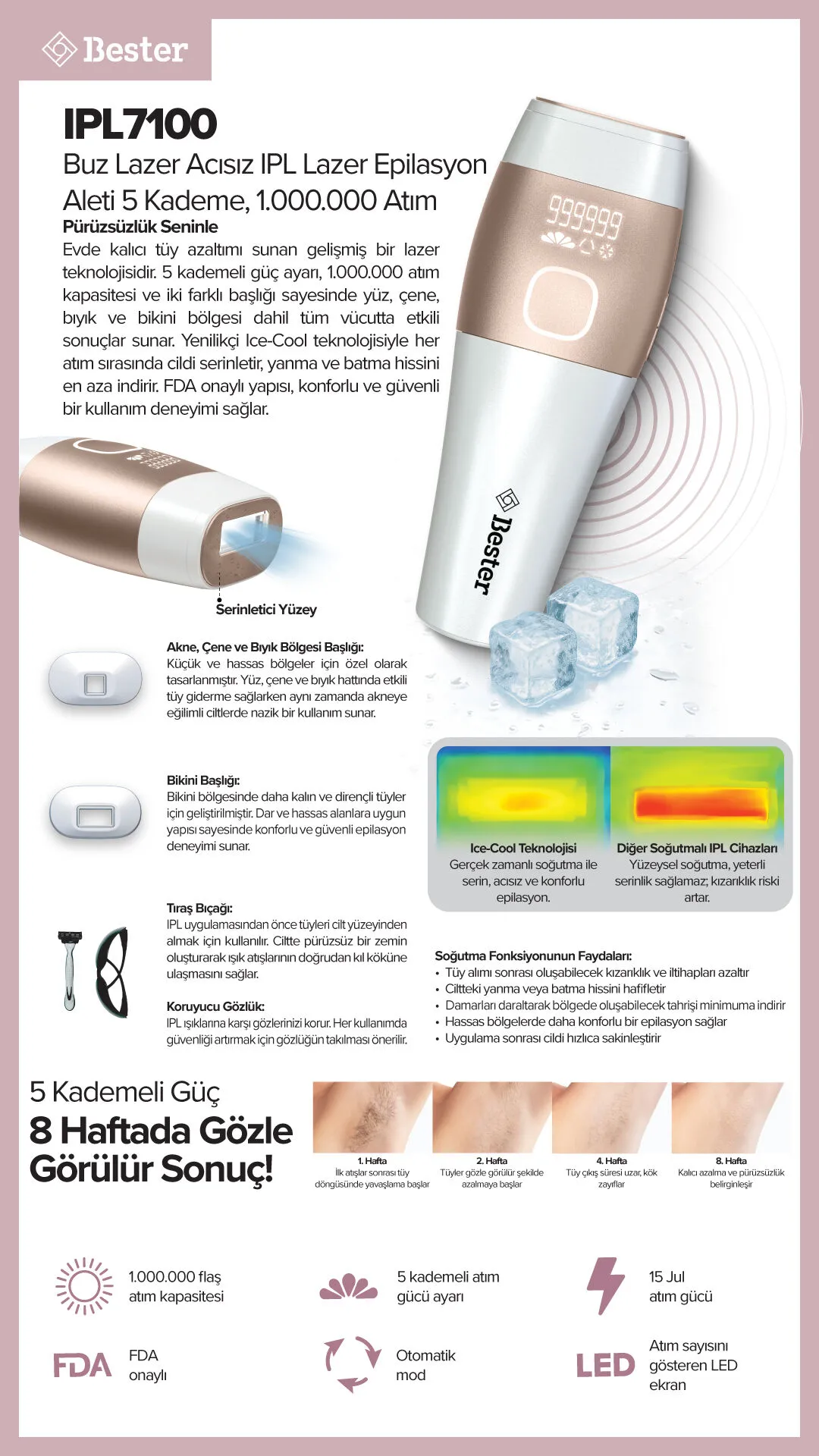 Bester IPL7100, evde kalıcı tüy azaltımı sunan gelişmiş bir lazer teknolojisidir. 5 kademeli güç ayarı, 1.000.000 atım kapasitesi ve iki farklı başlığı sayesinde yüz, çene, bıyık ve bikini bölgesi dahil tüm vücutta etkili sonuçlar sunar.