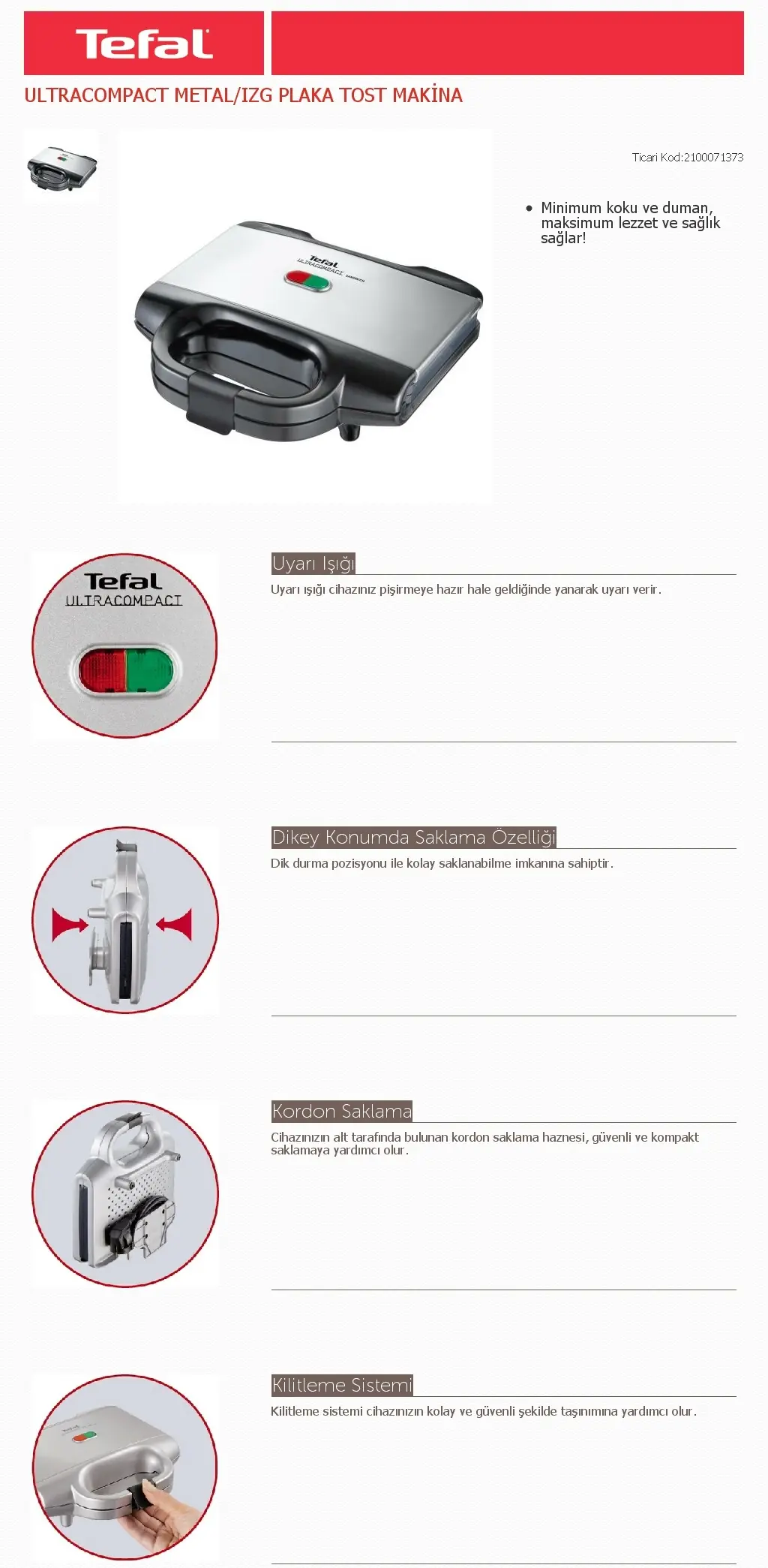 Tefal Ultracompact Metal Tost Makinesi, modern mutfakların vazgeçilmez bir parçası olarak tasarlanmıştır. Kompakt yapısı sayesinde az yer kaplayarak, her mutfak tezgahında kolayca yer bulur. Metal dış yüzeyi, hem estetik bir görünüm sunar hem de dayanıklılığı artırır, böylece uzun ömürlü bir kullanım sağlar.